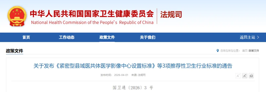附件下载:《紧密型县域医共体医学影像中心设置标准》紧密型县域医共体医学影像中心行业标准国家卫生健康委员会于2026年3月17日发布《紧密型县域医共体医学影像中心设置标准》等3项推荐性卫生行业标准,编号和名称如下:紧密型县域医共体医学影像中心设置标准.pdf 紧密型县域医共体心电诊断中心设置标准.pdf 家庭病床康复服务标准.pdf END