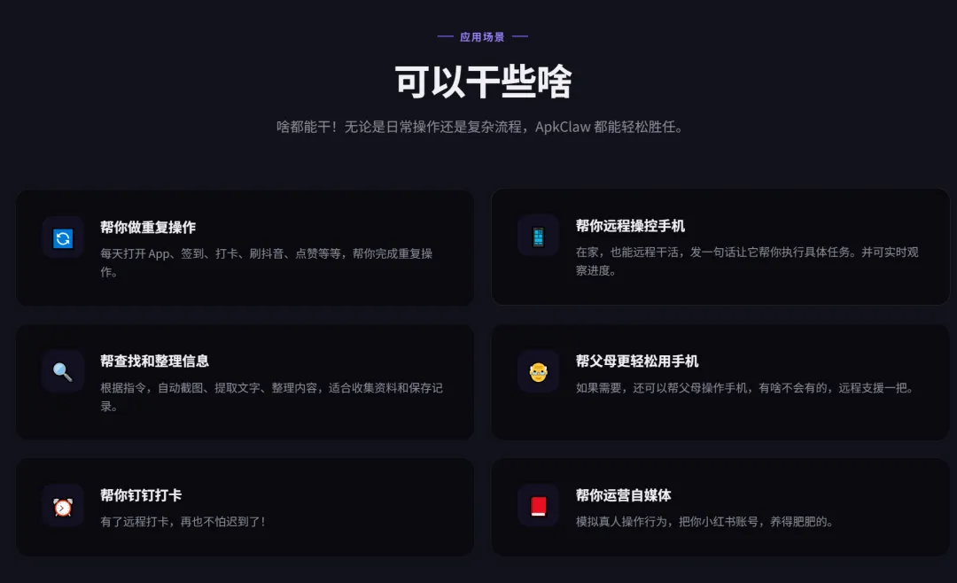 ApkClaw 的使用场景非常广泛。它不仅能处理简单的日常操作,也能承担更复杂的流程任务,让手机从“被动等待点击”变成“能够主动执行指令”的智能终端。