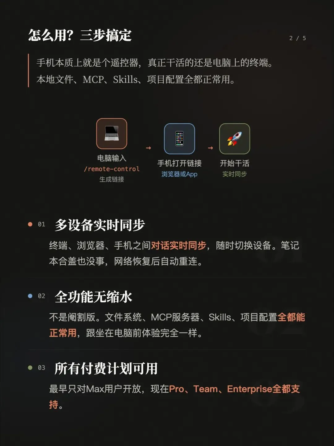 指令流转:手机发消息 → Claude 服务器中转 → 电脑本地执行 → 结果回传手机。本地文件、MCP 服务器、Skills、项目配置全部无缝沿用,与坐在电脑前操作体验完全一致。