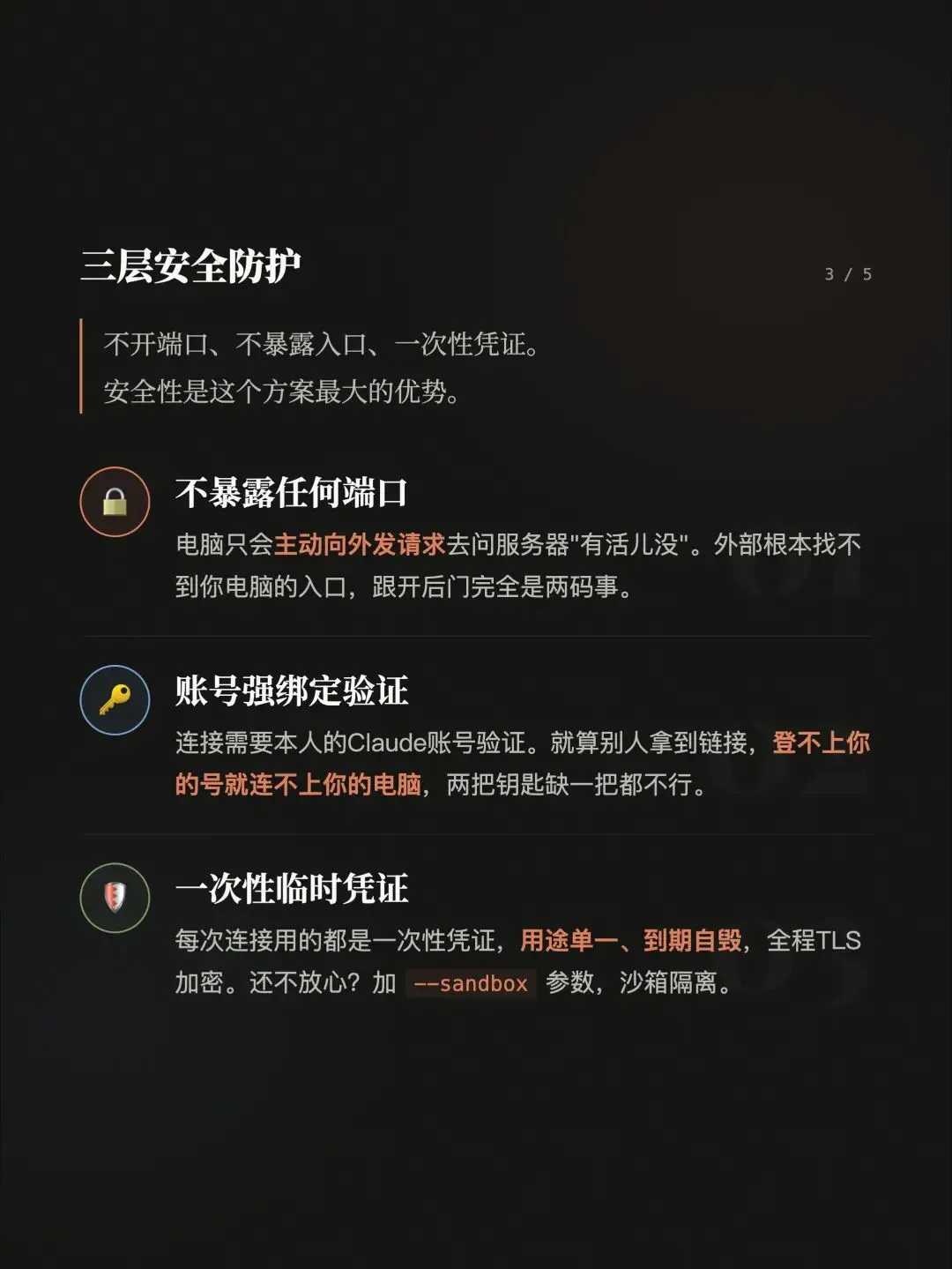 不暴露任何端口:电脑仅主动向 Claude 服务器发送请求,外部无法找到电脑入口,无任何后门风险;