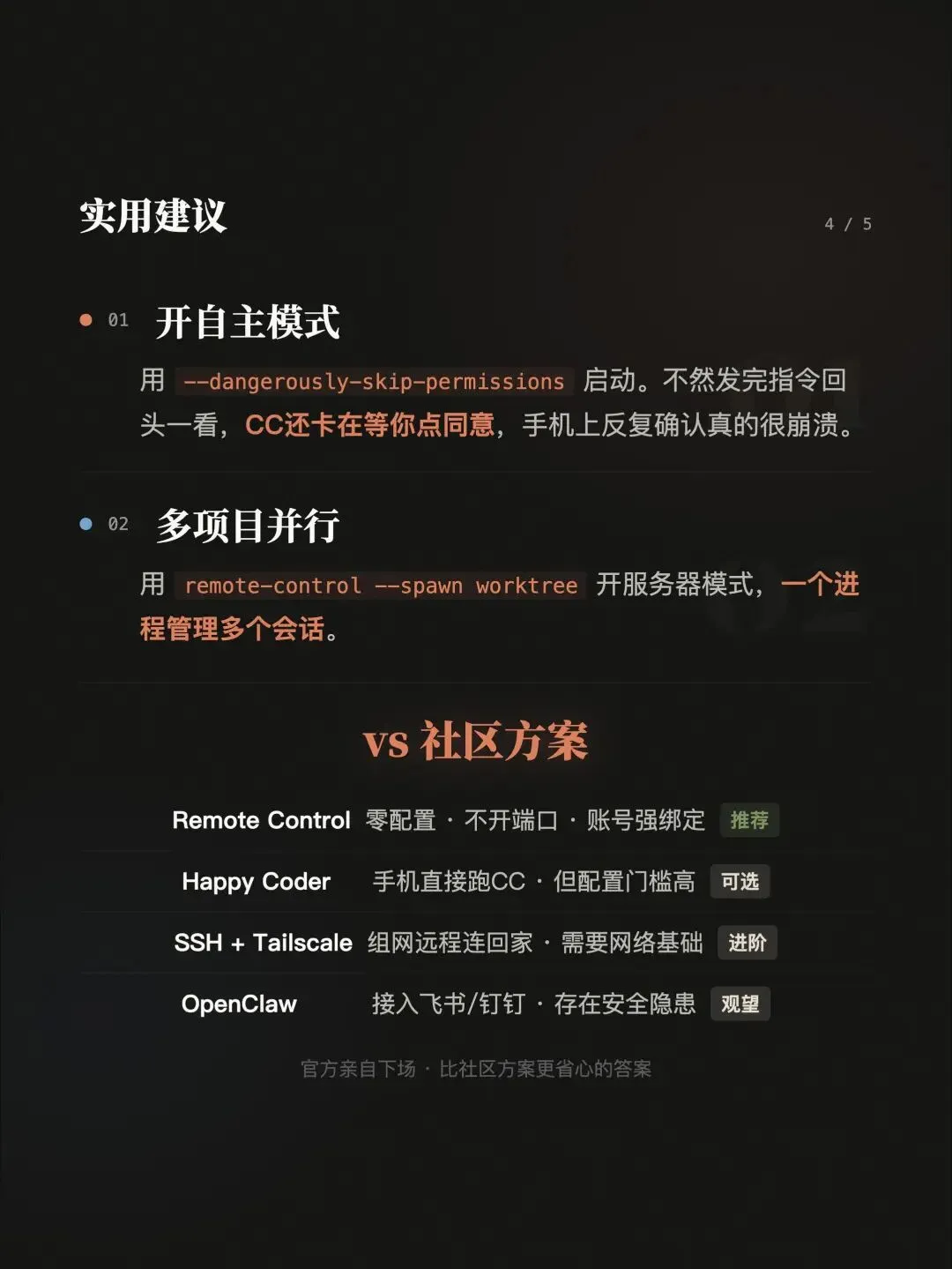 核心建议:启动 Claude Code 时,添加以下参数,开启自主模式,避免手机发完指令后,电脑端反复弹窗请求确认,来回切屏影响体验。