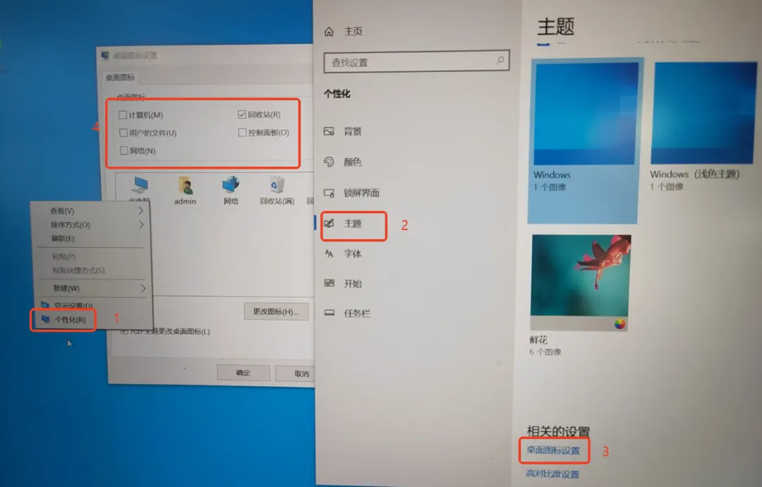 桌面空白处,右键-个性化-主题-桌面图标设置