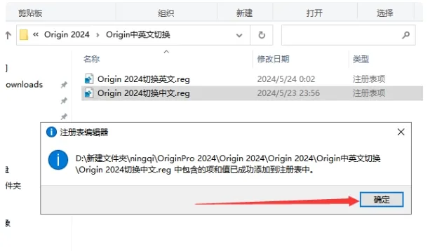 18. 打开Origin中英文切换文件夹,双击运行【Origin 2024 切换中文.reg】,弹出对话框,点击【是】。