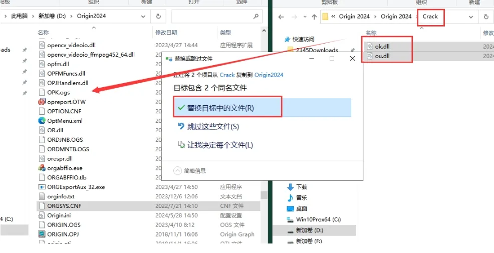 22. 将【Crack】文件夹里的两个破解补丁复制到刚才打开的软件安装目录中进行替换。