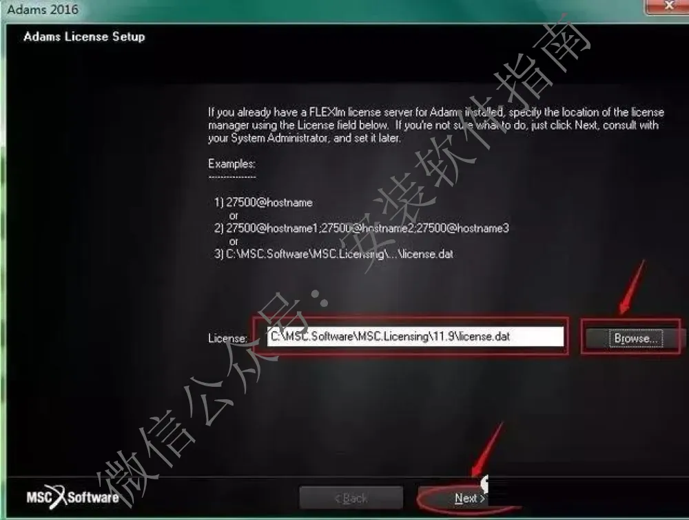 22.安装完成后会弹出以下界面,点“Browse”选择前面生成的许可文件license.dat(许可安装中新生成的),路径C:MSC.SoftwareMSC.Licensing11.9license.dat,然后点Next。