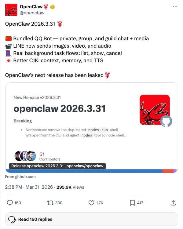 01|第一条更新:OpenClaw 2026.3.31,不是补丁,是工作流能力的一次打包升级
