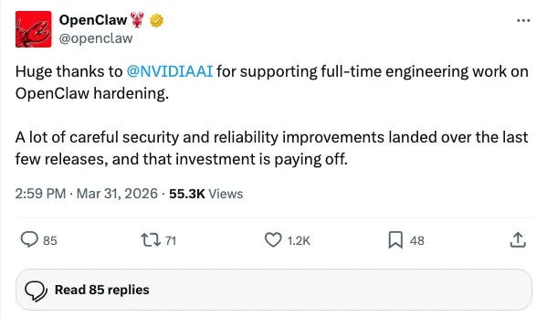同一天还有一条看起来没那么“产品化”的更新:OpenClaw 提到,过去几个 release 里做了很多安全和可靠性加固,而且这些投入已经开始体现价值。