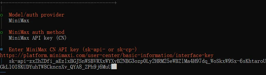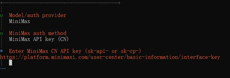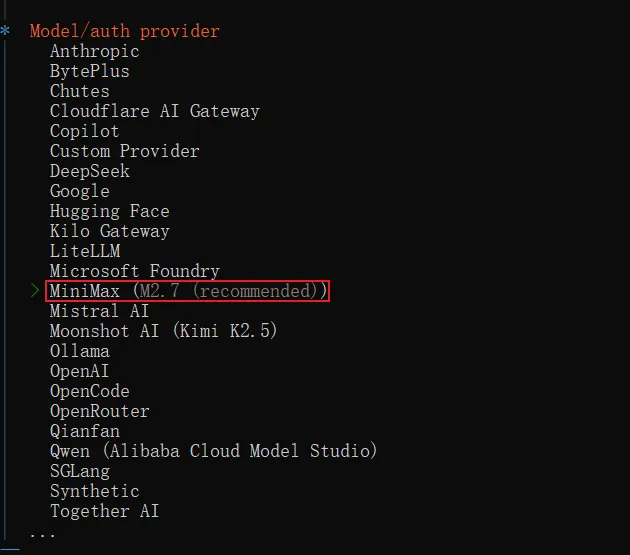 这里带大家配置一下其它模型提供商。我们选 MiniMax,它的控制台页面比较简洁,注册、登录以及管理 API Key 都相对友好,而且前期的免费额度也足够使用。另外,它还是 OpenClaw 之父 Peter Steinberger 本人在公开场合推荐过的模型。你也能看到,选项里 MiniMax 后面还标着 (recommended) 推荐标识。