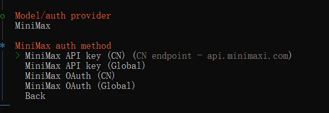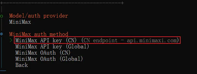按回车后进入到详情,我们看到有四个选项。选项 1 和 3 ,括号中标识了 CN,是让国内用户用的;选项 2 和 4,括号中标识了 Global,是让海外用户用的。因为国内和海外的语言、登录验证、支付方式都不一样,所以 MiniMax 的主站点和控制台页面也就有两套。如果你是在国内站点维护 apiKey 的,那么你要选择选项 1 和 3;如果你是在海外站点维护 apiKey 的,那么你那么你要选择选项 2 和 4。