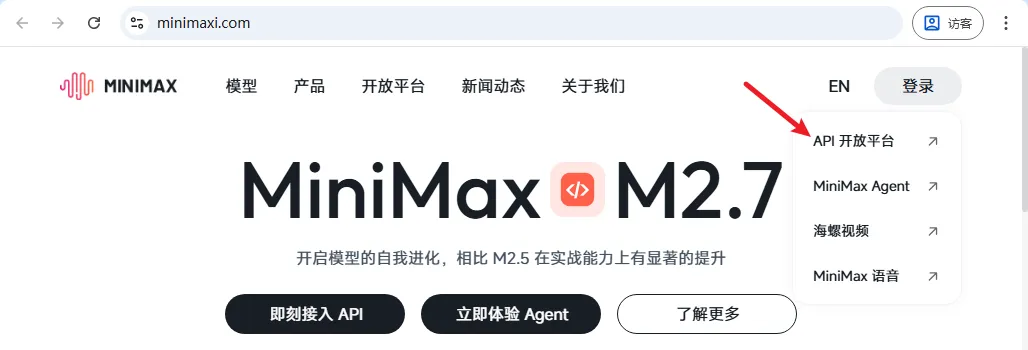 配置之前,我们需要到 MiniMax 开放平台去生成有效的 API Key,在国内主站,右上角登录这里,选择 API 开放平台