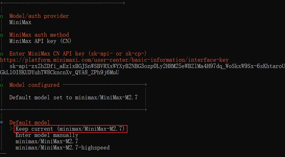 粘贴好后,回车,后续的步骤就和我们之前配置 Qwen (OAuth)一致了,这里同样让我们选择一个默认模型,我们就保持默认这个第一个选项,Keep current
