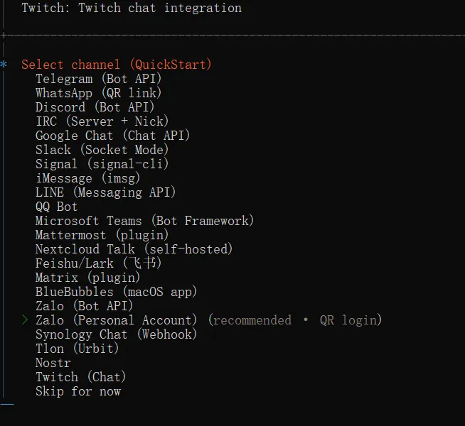 回车之后,模型配置就结束了,后边的流程就和上个课程基本一致了,比如接下来就是配置聊天渠道了。