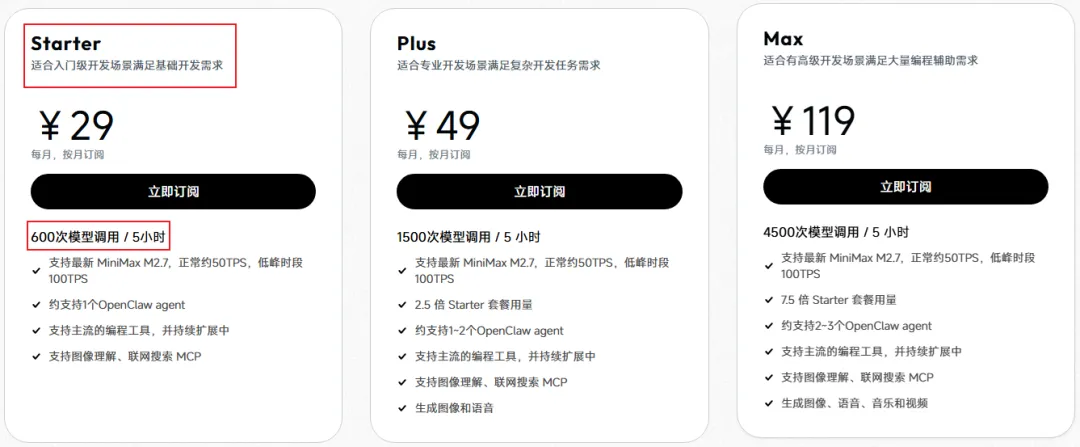 如果是 MiniMax 的话,这个基础的 Starter 套餐基本就足够大家使用了。它是每 5 小时 600 次的调用量限制,比方说你是 5 小时内用完了 600 次,顶多再过 5 小时又有 600 次可用了,大概是这个意思。而且你发现没有,它是根据调用次数,不是根据 Token 使用量的。