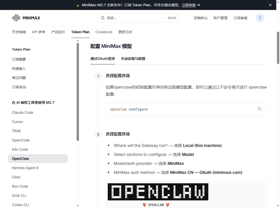 另外,MiniMax 对于 Token Plan 的配置还支持 OAuth 认证方式。也就是开头带大家介绍过的选项 3,那么具体的配置步骤,日后你都可以参考官方的文档: