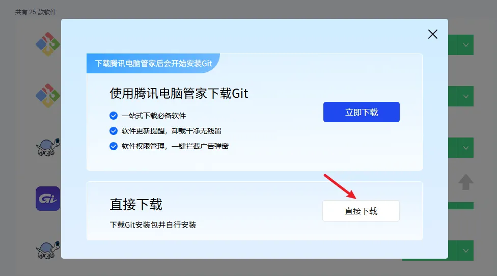 点击 “立即下载” 后,在弹出的窗口里选择下方的 “直接下载”。不要点上面那个 “立即下载”,不然会先给你下载腾讯电脑管家。