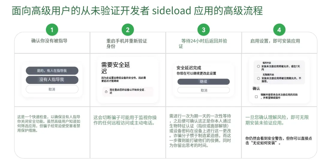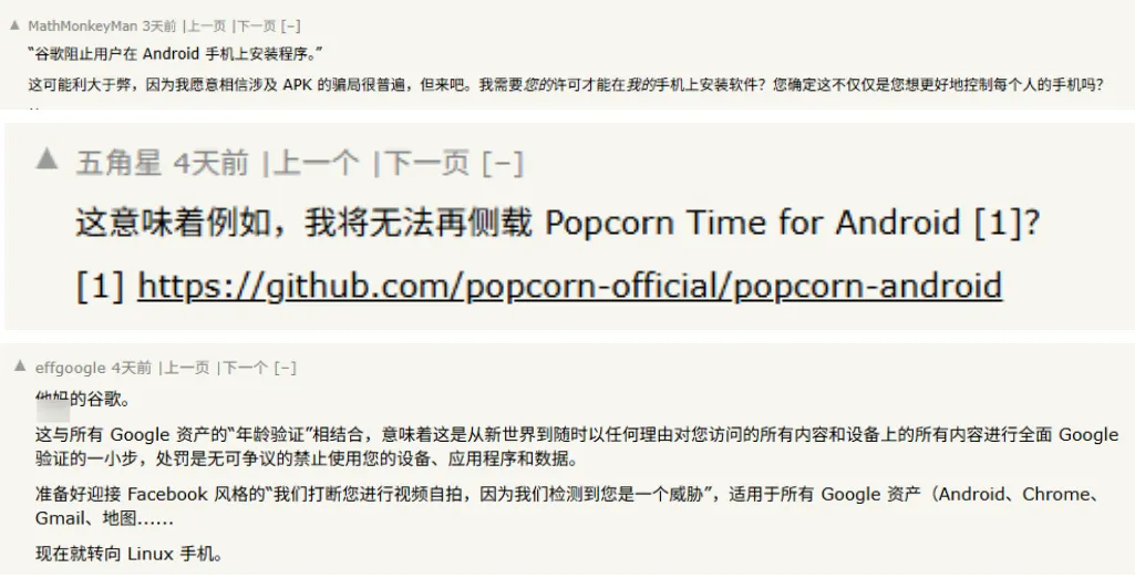 自由安装应用权限无了,安卓开始变成iOS的形状本文来自电手(ID:AoMeiDianShou),未经授权不得二次转载这可能是谷歌做出让 Android 折腾党最头痛的一次决定。曾经我们调侃隔壁 iOS 像个精致的“精装房”,虽好住但墙头高耸;而安卓则像个“DIY 房”,虽然要自己操心装修,但胜在自由:想装什么 App、在哪装、装哪个版本,全由用户自己说了算。而随着两边系统日益发展和完善,现在谷歌要给这间“DIY 房”加上一道比较繁琐的防盗门了。在 3 月 19 日,曾经高喊开源和自由的谷歌官宣正式推出了 Android 侧载应用的「高级安装流程」。(Advanced Installation Flow)给新来的同学简单解释下,侧载也就是不通过谷歌官方的应用商店和授权的第三方应用商店下载 APK 文件安装野生 App 的操作。在这条新政实施之前,Android 遇到侧载应用,会提示你未经过官方商店审核的风险提示,但你要是执意点击「无视风险,继续安装」,那 Android 也不拦着你,但后果自负。不过大伙儿知道,自由也意味着和危险并存,2017 年苹果甚至专门拍了条广告来 cue 安卓。所以在去年 8 月谷歌搞出了一条新政:从 2027 年开始,Android 实行所有 App(包括 Google Play、侧载和第三方应用商店)的应用开发者都要通过谷歌官方的验证。没通过验证的开发者所开发的 App,那就无法安装。有点类似 iOS 允许侧载的地区那一套。原因自然也是老一套「为了你好」,自称是保护用户的数据和财产安全。这项政策的目的是建立责任追踪机制,避免恶意软件的发布者被下架后再伪装身份从而轻易再次发布新的恶意软件。并且给出分析报告,称来自侧载的恶意软件比 Google Play 上的应用高出 50 倍。但这个开发者验证没那么容易,需要提供详细的地址、电话、电子邮件以及个人法定姓名,也就是说,要求开发者上交「身份证」。并且还需要 25 美元的注册费(约合 181 元人民币)。对于大公司而言可能没啥影响,但对于个人开发者或者小众软件开发团队来说,这无疑是一次打击。毕竟用爱发电就算了,现在还得付费发电,这谁能接受?现在变成通过验证的开发者可以直接侧载,而没有通过验证的开发者应用需要进行以下的步骤流程:并且用户可以自己选择这个高级的「安全设置」7天或者永久关闭。这意味着如果你晚上 11 点在被窝里想安装一个应用,得等到第二天晚上的 11 点才能用上。谷歌允许这套侧载权限在换机时进行迁移,也就是说换完机的设备不需要再进行开启流程。并且遇到银行这类敏感的 App,彻底开启侧载权限后也可以关闭开发者选项不耽误 App 使用。那有人要问了,如果非常急用等不了 24 小时怎么办呢?针对这种情况,谷歌也没堵死,这种应用也可以通过 ADB 命令安装,因为需要一定的门槛,也能规避一些小白用户安装有害软件。看到这可能有同学发现了,跟国产 Android 目前的拦截有点类似,不过还没有谷歌这么麻烦,那咱们会不会也跟进呢?这条新规是针对享受谷歌全家桶,也就是有 GMS 授权、Google Play 这类设备,并未在 Android CDD(兼容性定义文档)做硬性规定。也就是说国内 Android 基本不受约束。不过也别高兴得太早, 这套验证逻辑的「青春版」其实在国内的 Android 上早就有了,只是谷歌把它推到了极致。并且从厂商们统一提高解 BL 锁难度这点来看,对于缩紧自由度这方面来看, Android 阵营的做法其实是趋同的。验证麻烦其实都是小问题,问题的症结在于,目前谷歌已经把手掐在侧载权限的脖子上了。数据素材来源:android-developers、Reddit,图源网络。