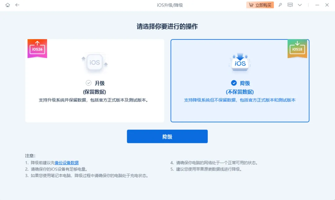 降级操作会抹掉设备上的所有数据。如果你在升级 iOS 26.5 Beta 时没有备份旧系统数据,降级后将无法恢复。