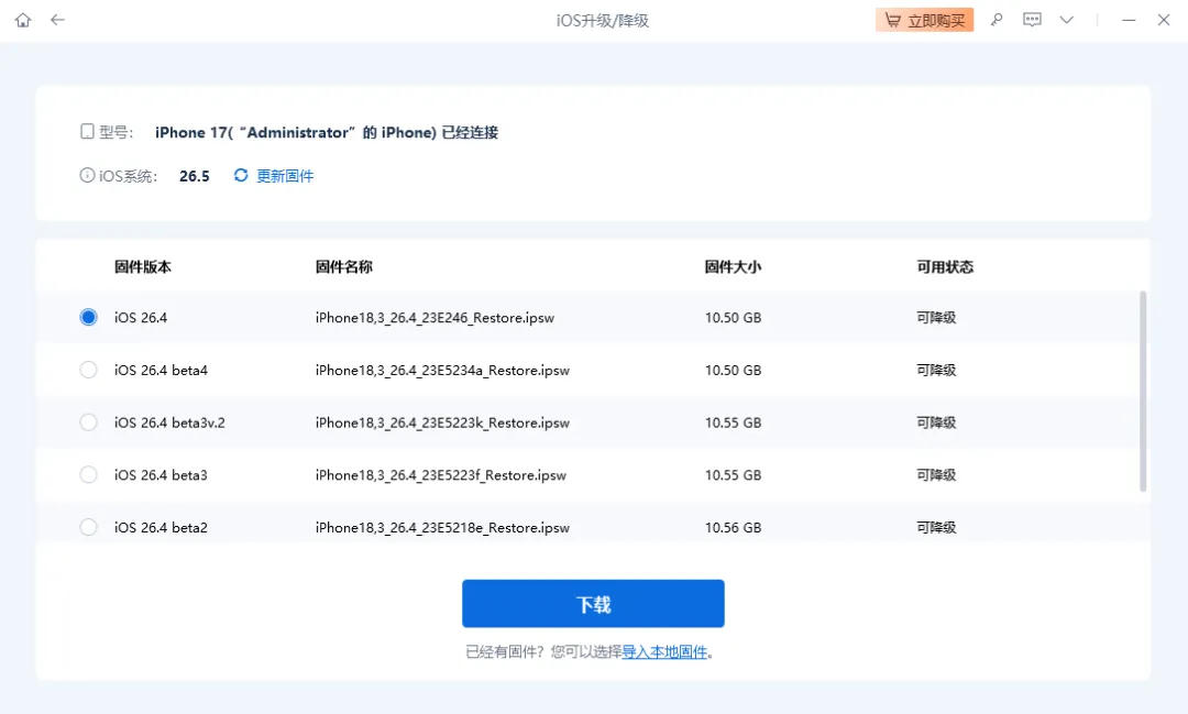 第2步:在支持降级系统界面的“固件版本”中,选择未关闭验证通道的iOS26版本,然后点击“下载”,等待固件下载完成。