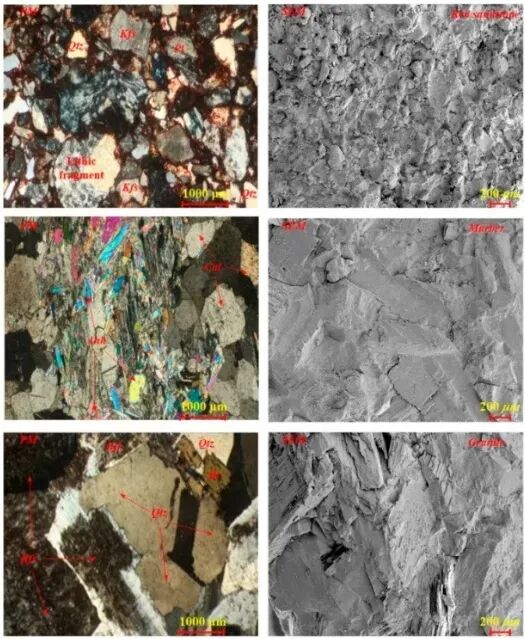 图1. 三种岩石的显微结构和成分。Qtz—石英,Pl—斜长石,Kfs—钾长石,Cal—方解石,Anh—无水石膏,Bt—黑云母。