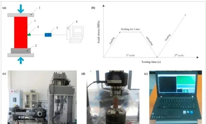 图2. 单轴循环加载和卸载试验的配置。(a) 示意图,1—试验系统的加载板,2—底座,3—岩石样品,4 —声发射(AE)传感器,5—AE前置放大器,6—数据分析器;(b) 应力加载路径;(c) MTS 816岩石力学试验系统;(d) 岩石样品和AE传感器的安装;(e) DS5-A声发射测试和分析系统。