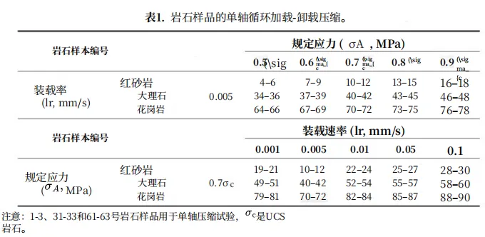 3.实验方案:进行单轴循环加载和卸载测试,包括两个阶段:第一阶段为应力控制模式下的加载保持,第二阶段为位移控制模式下的加载速率变化。