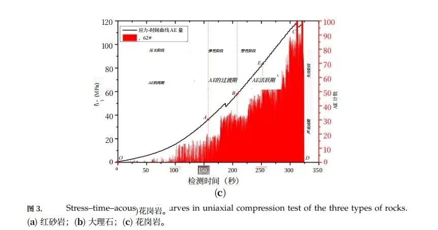 岩石在单轴压缩过程中,应力 - 应变、变形破坏与声发射(AE)三者呈现严格的时序对应关系,整体划分为四个阶段:(图3)显示了三种岩石在单轴压缩下的AE特征