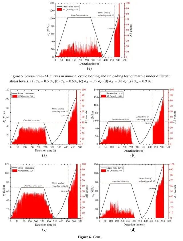 第一阶段:采用应力控制模式,以1.0 MPa/s的速率将加载应力施加到预定值(σA)。σA分别是岩石UCS(σc)的50%、60%、70%、80%或90%。然后,载荷保持不变三分钟,以消除岩石内部微结构表面之间的摩擦和滑动引起的AE事件对后续实验结果的影响[22,23,28,31]。然后将轴向应力以1.0 MPa/s的速率卸载至0.5 MPa。请注意,轴向应力不为零,这确保了加载系统中的承载板在测试过程中与岩石样本的端面完全接触。
