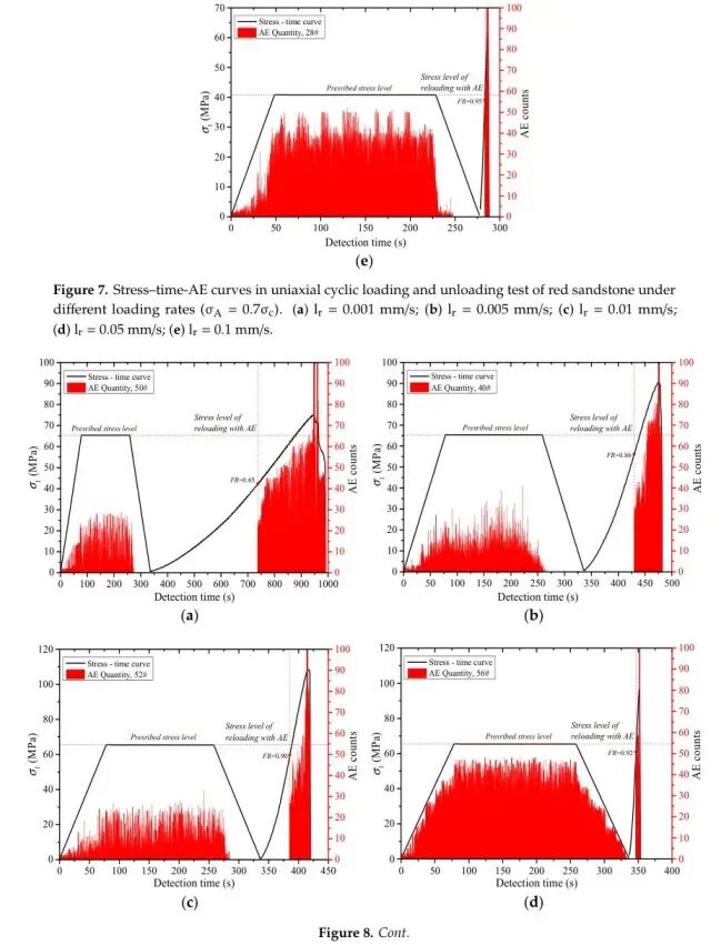 第二阶段,采用位移控制模式以避免岩石样品在应力控制模式下突然失效。加载速率(lr)分别设定为0.001 mm/s、0.005 mm/s、0.01 mm/s、0.05 mm/s和0.1 mm/s。相应的应变率大约为10^-5/s。到10−3/s,属于中等和低应变率水平 [29,32,33]./s,属于中等和低应变率水平 [29,32,33].