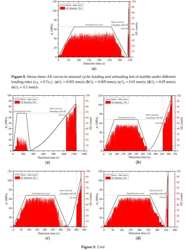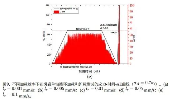 注意:图3–9分别显示了三种岩石在单轴压缩和单轴循环加载卸载条件下的声发射特性