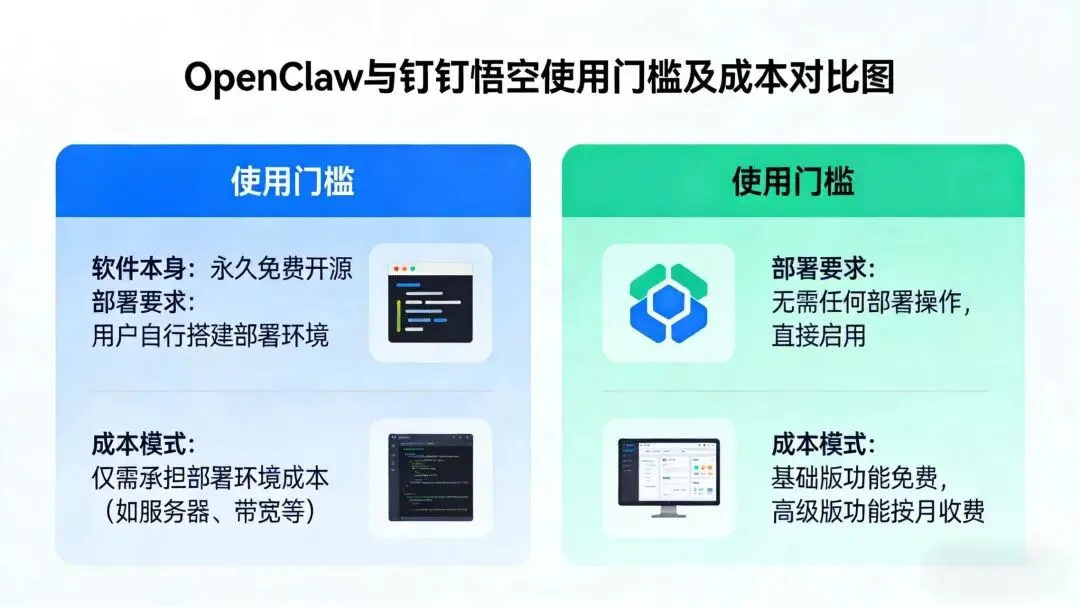 钉钉悟空无需任何部署操作,在钉钉平台内即可直接启用,企业管理员一键开通就能全员使用,全程零技术门槛,普通员工无需学习即可快速上手,基础功能免费使用,高级版采用按人 / 月订阅模式,费用公开透明,企业可统一结算、成本可控,还有官方 7×24 小时售后维护,省去了所有技术调试与维护成本。