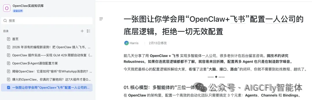读取 SOUL.md(它知道自己是主笔,有风格规范) 读取 STYLE_REFERENCE.md(知道标题公式、开头模式、结尾要求) 搜索素材(调用自己的工具) 按我的风格写初稿 推送飞书文档给我审核 我审核修改:花 5 分钟改几个表述