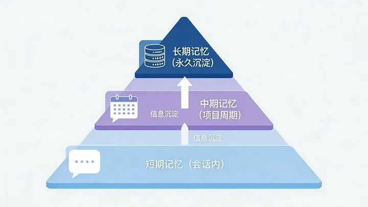 第二层是中期记忆,以日期/项目周期为维度,将每日、每个项目的关键交互信息与需求变更,压缩提炼为结构化摘要。