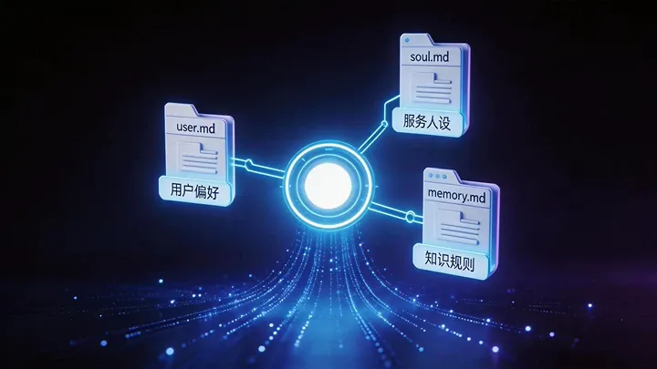 第三层是长期记忆,它会从日常交互中提炼核心精华,沉淀为三大核心文件:记录使用者操作偏好的user.md、定义AI服务人设与标准的soul.md、沉淀行业知识与合规规则的memory.md。
