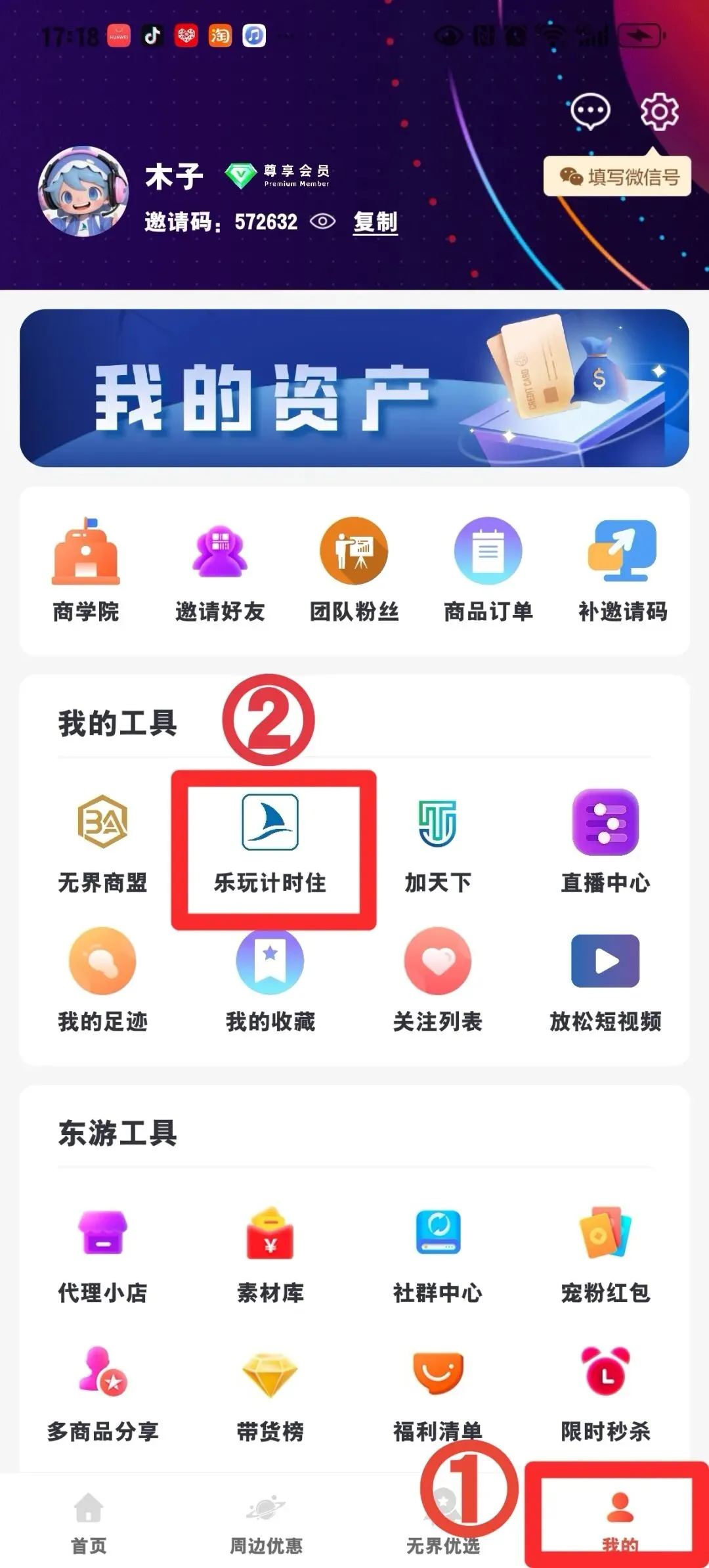 打开东游记 APP → 右下角点【我的】→ 找到【乐玩计时住】进入小程序,权益全互通