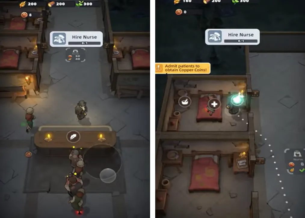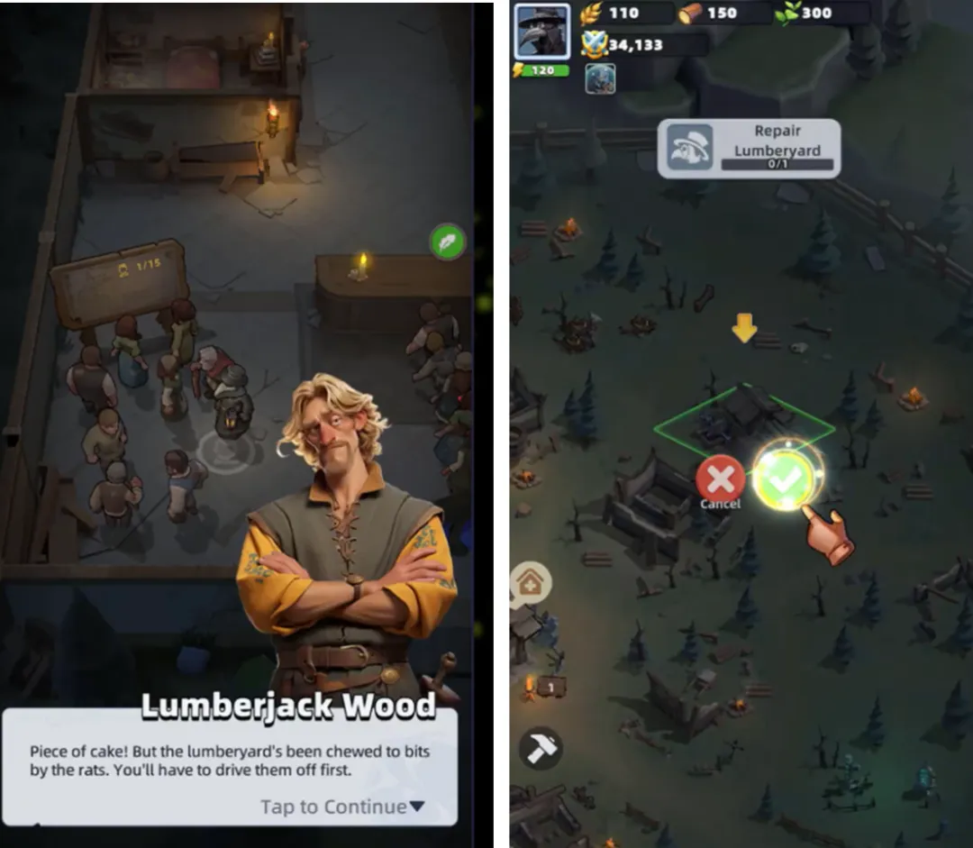 在救治过程中,病房突遭老鼠袭击受损,急需木工修葺。而木工告知木材堆置场同样受到老鼠侵扰,需先驱赶鼠患。随之而来的一名受伤骑士求助,顺势解锁英雄系统。