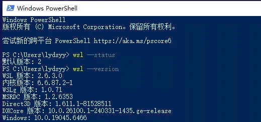 输入以下命令检查系统内置的 WSL 版本与运行状态: