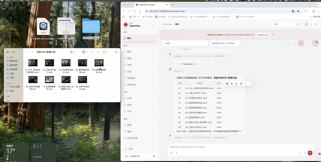 OpenClaw 自动建立文件夹、完成剪辑、按顺序命名。完成后在对话框中汇报结果。