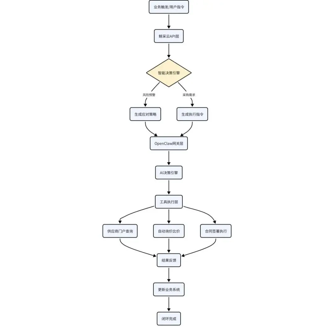 鲸采云与OpenClaw的融合,本质上是"决策大脑"与"执行手脚"的有机组合。这种技术协同将采购管理从被动响应升级为主动执行,实现了从需求识别到任务完成的完整闭环。