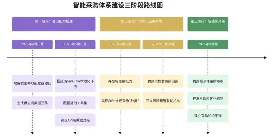 生态协同演进包括行业平台互联(不同企业的采购智能体在安全框架下进行数据与能力共享)、供应链金融融合(智能采购系统自动触发供应链金融服务,优化企业现金流),以及可持续发展集成(ESG评估模型深度融入供应商选择与绩效管理)。