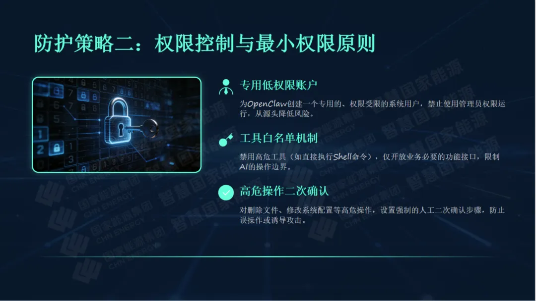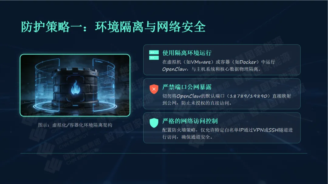 另外,针对OpenClaw的核心安全风险,围绕“最小权限、环境隔离、插件治理、全流程管控”原则,明确了针对性防护措施。从严控网络暴露面、强化凭证加密管理,到规范插件使用、防范提示注入,再到完善审计日志、及时修复漏洞,逐一拆解操作要点,确保每位员工都能掌握实用的防护方法。