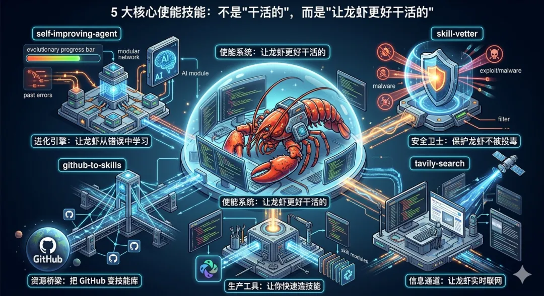 📌 self-improving-agent — 进化引擎 — 让龙虾从错误中学习📌 skill-vetter — 安全卫士 — 保护龙虾不被投毒📌 tavily-search — 信息通道 — 让龙虾实时联网📌 skill-creator — 生产工具 — 让你快速造技能📌 github-to-skills — 资源桥梁 — 把 GitHub 变技能库