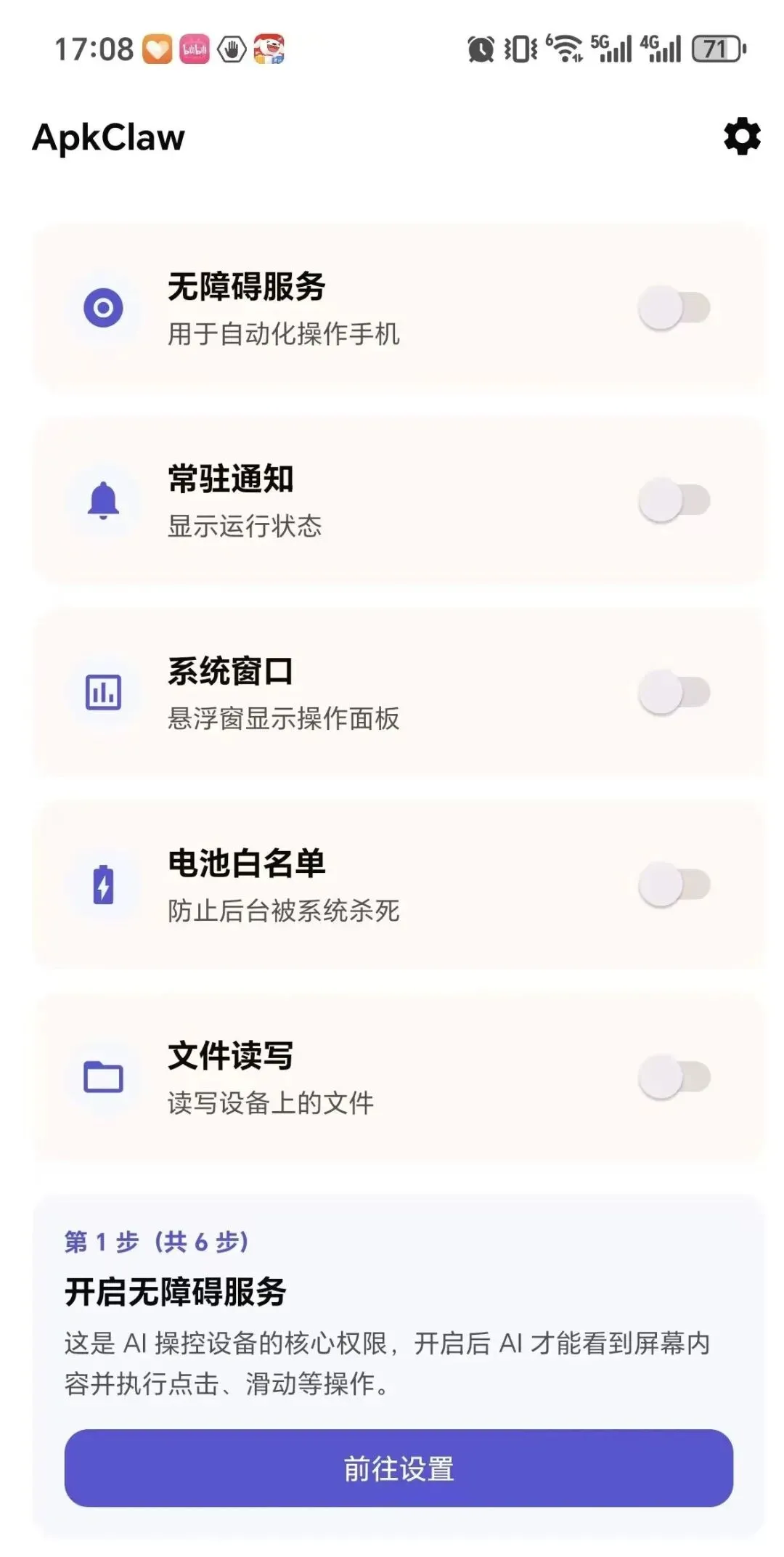 ApkClaw 需要多个权限才能正常工作,逐一说明: