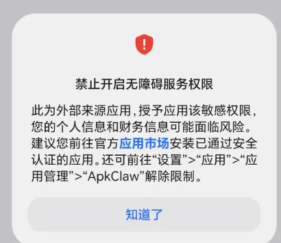 ApkClaw 需要比较高的系统权限。