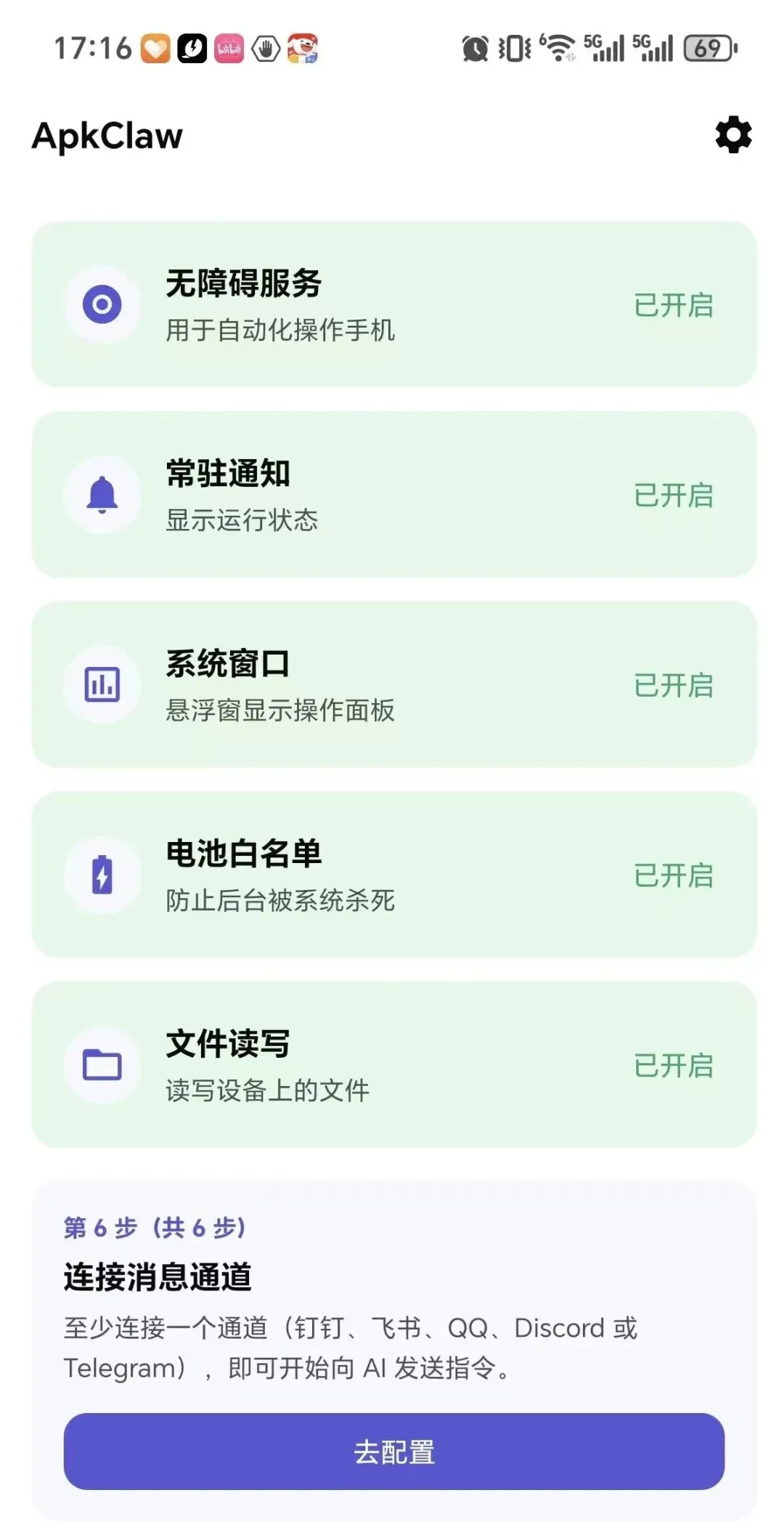 开启后,ApkClaw 才能"看懂"手机屏幕上的内容,并代替你点击。