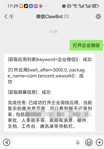 然后我们就可以通过微信对话,来控制手机干活了