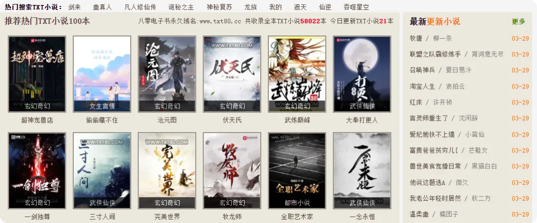综合类免费小说平台,涵盖网络小说、经典名著等,支持TXT下载和在线阅读,资源更新频率高。