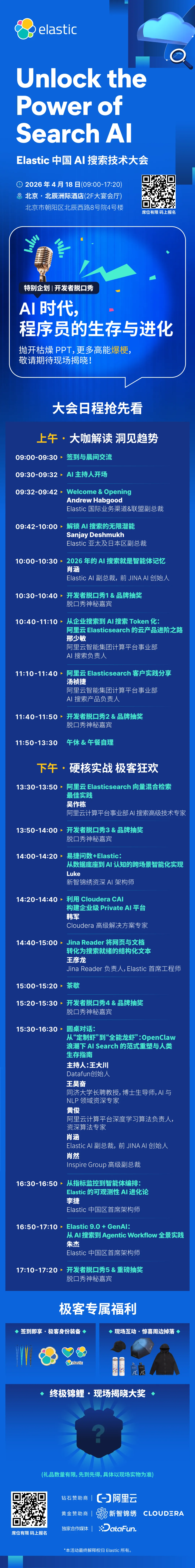 4月18日,09:00-17:20,在北京·北辰洲际酒店,欢迎您参加Elastic中国AI搜索大会,届时将为您带来Elastic在AI搜索和AI Agent时代的前沿技术与最佳实践,以及OpenClaw浪潮下AI搜索的范式重塑!感兴趣的小伙伴,欢迎扫码报名参会!