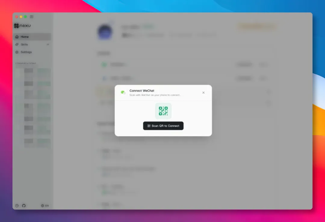 打开 nexu,登录你的账号,然后连接你要用的聊天渠道(微信 / 飞书 / Slack / WhatsApp / Discord)。