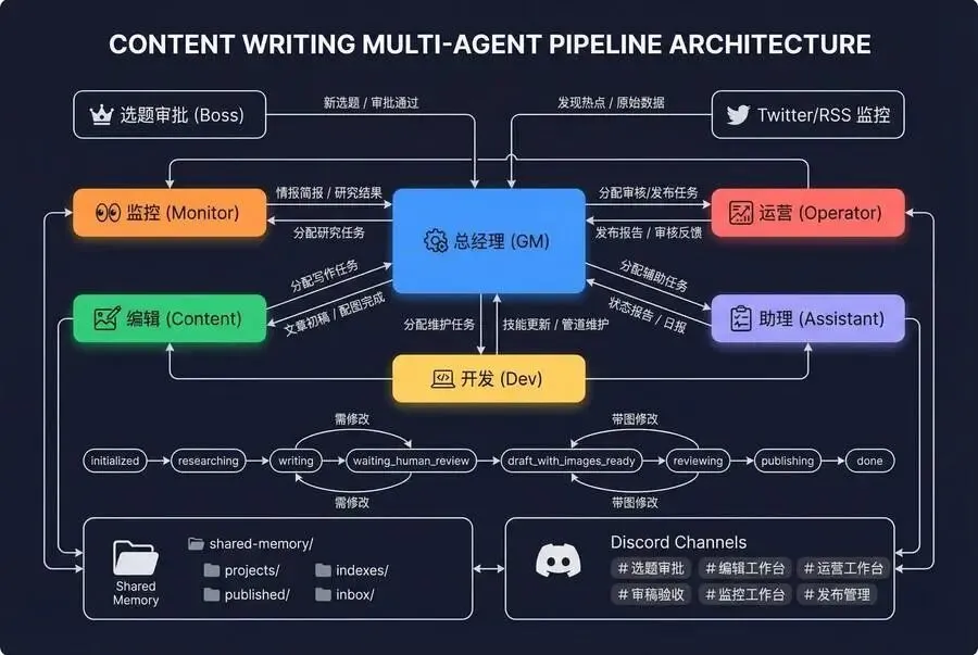 一开始只有一个"总经理"Agent,什么都干。很快它就扛不住了:要调度任务、要搜索素材、要写稿、要审核、要发布……就像一个公司只有 CEO,没有员工。
