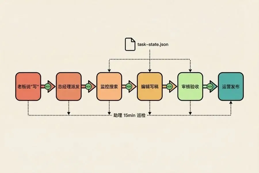 2. 握手协议交接必须有确认,不再是 fire-and-forget。总经理派发任务后,要等监控回复"素材收到";编辑交稿后,要等审核回复"初审通过"。每一步都有 ACK。